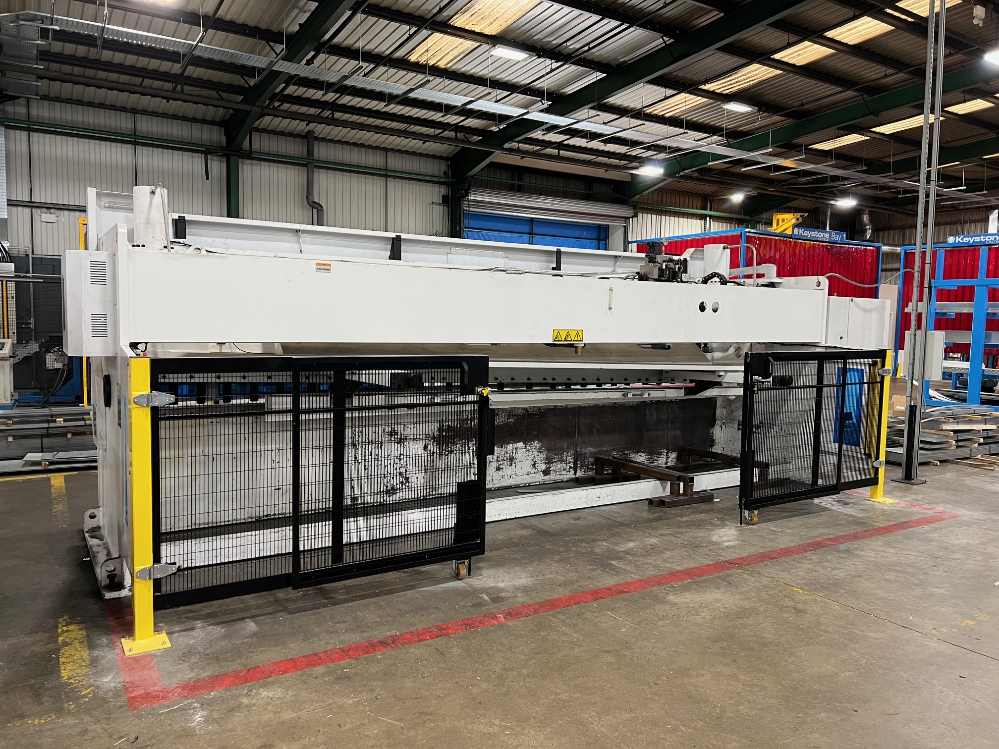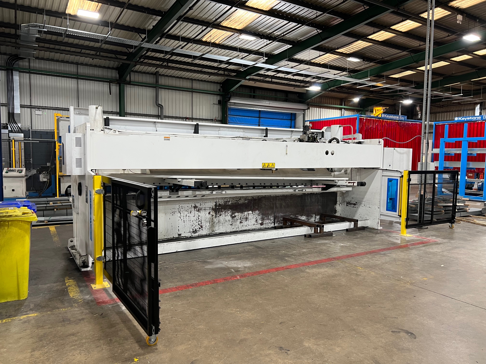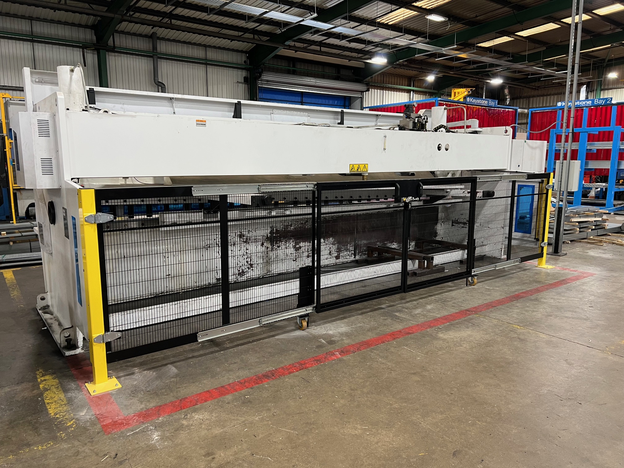 The Guillotine bespoke guarding project was installed to the rear of the Guillotine to replace the customer’s standard light curtains that they had. We have replaced a number of these on-site over the last couple of years. The main issue for this is that on odd occasions, the steel that is trimmed off can sometimes back the light curtain beams, which means that the machine needs to be re-sent. The Low-level bespoke guarding eliminates this from happening and provides a more of a fix safety barrier between workers and the moving parts.