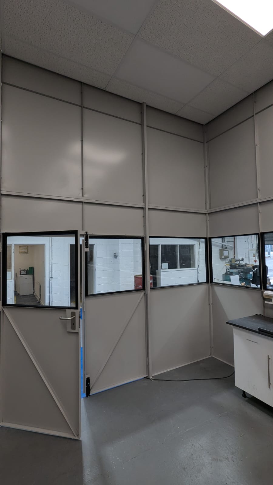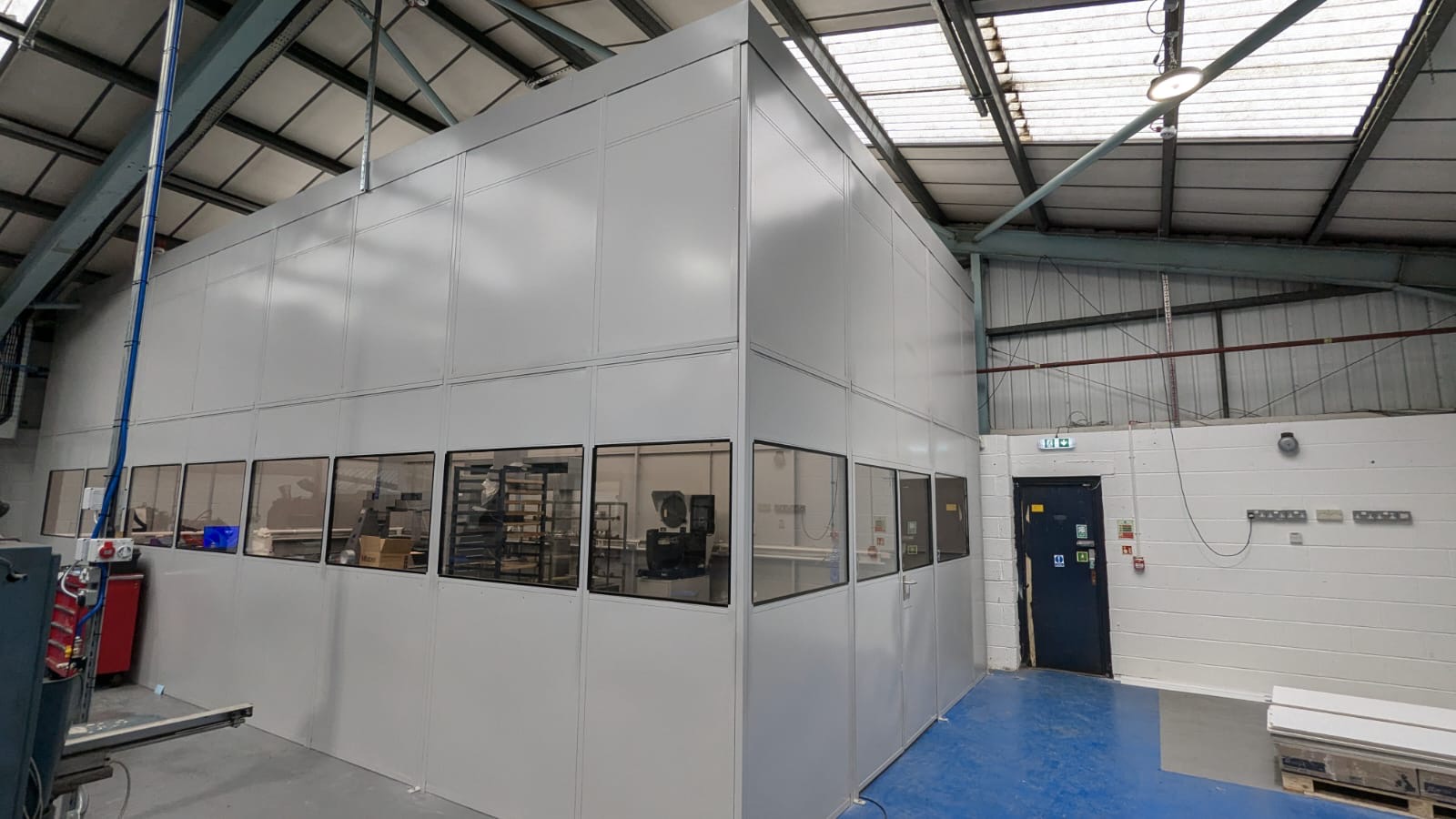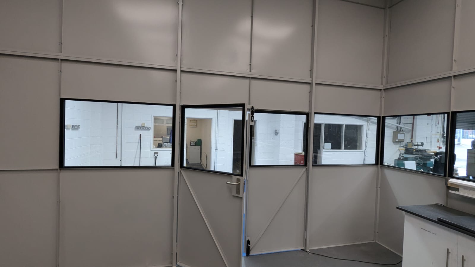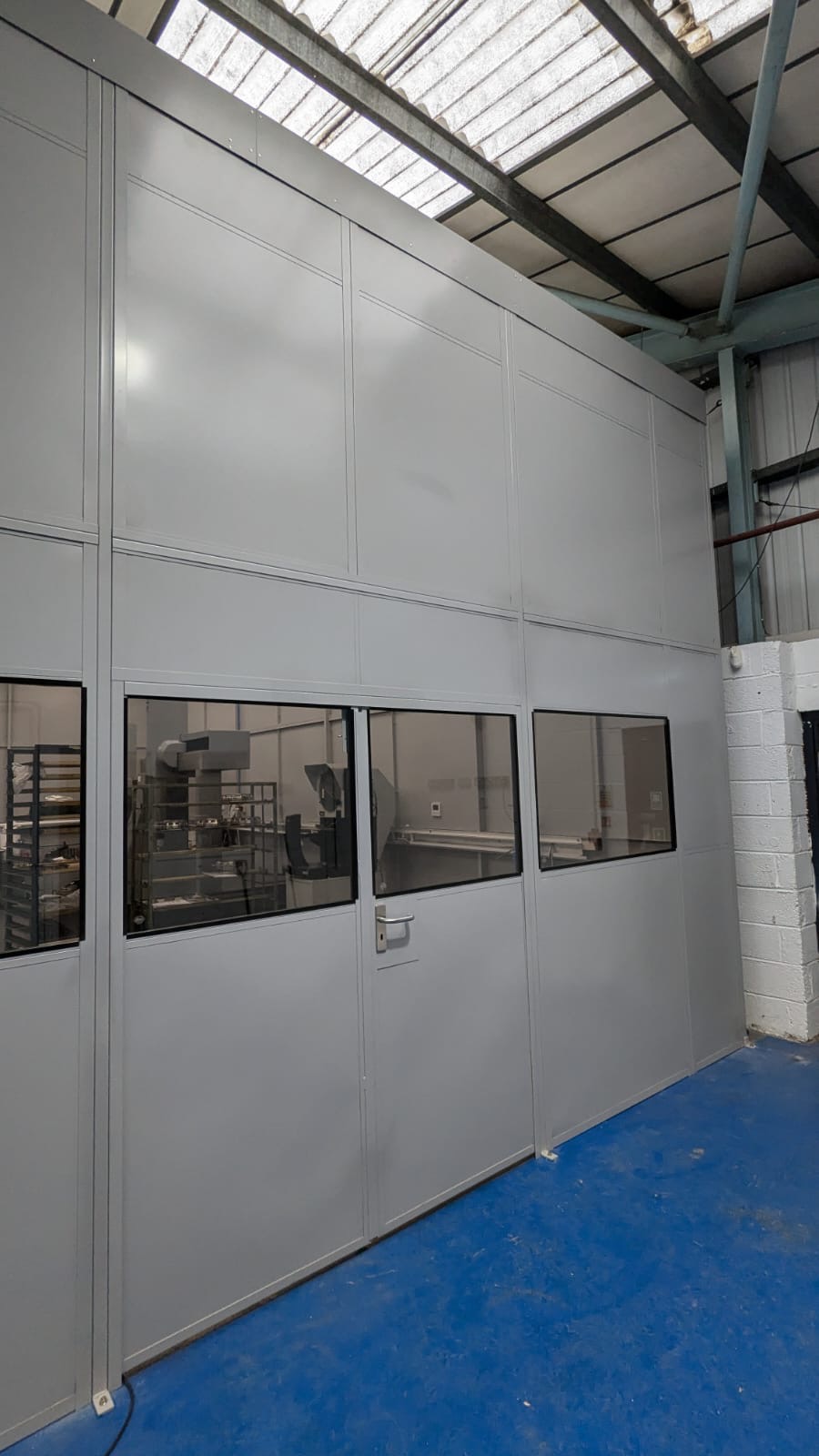 This Single Skin steel partitioning system was supplied and installed in Nottingham in 2 stages. The customer wanted to create a calibration room and a measuring room for the products. We used the standard single skin partitioning to do this with a second lift of panels on top of the standard 2.44m high panels.