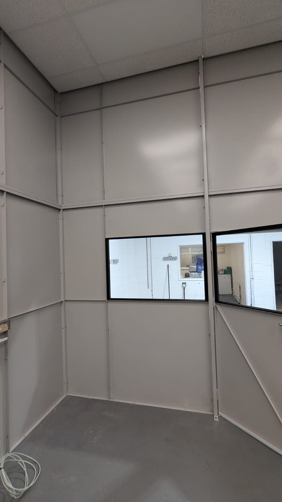 The first stage of the installation was around 85% of the partitioning, leaving the front section where the door was, meaning that the customer could then install the machines and equipment inside the room before we completed the installation.