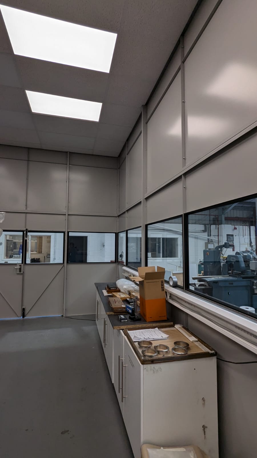 The room was a 4-sided room with 2 of the walls being of all solid elevation and the other 2 remaining sides being solid / glass / solid elevation. Enclosure was just supplied with 1 double door to the front for bringing products in and out when they needed testing.