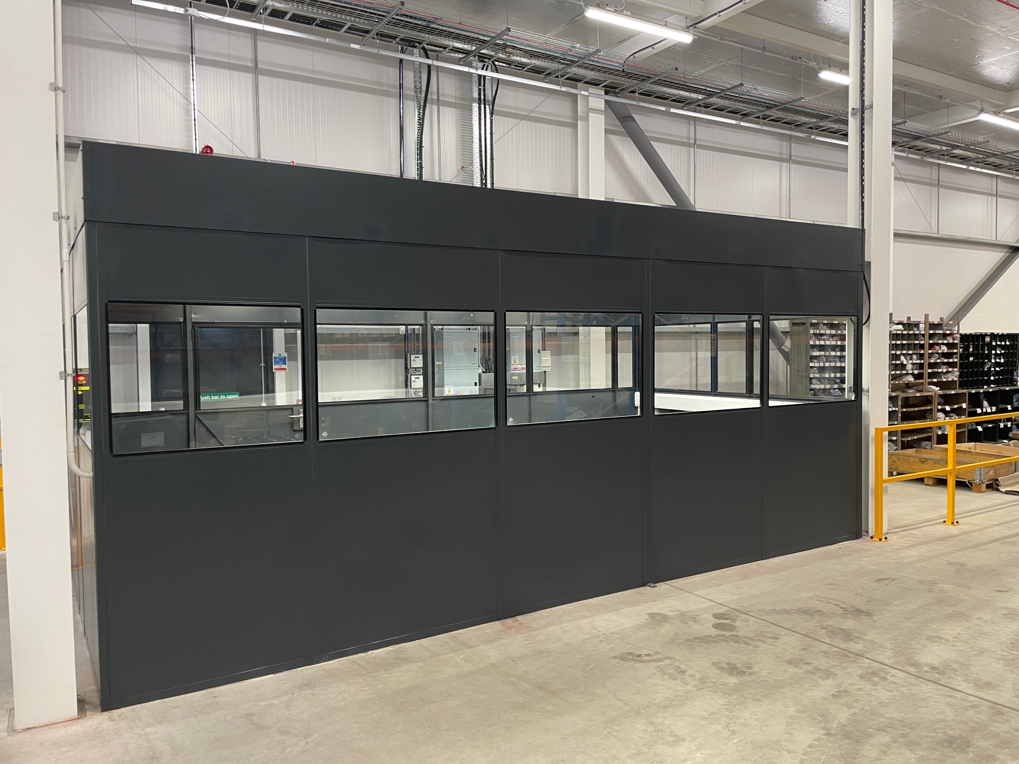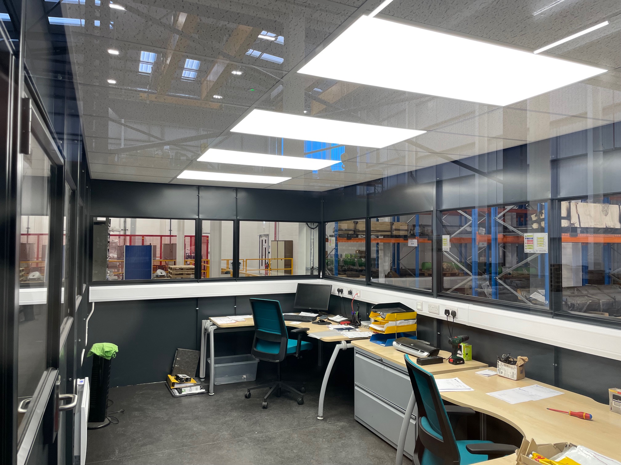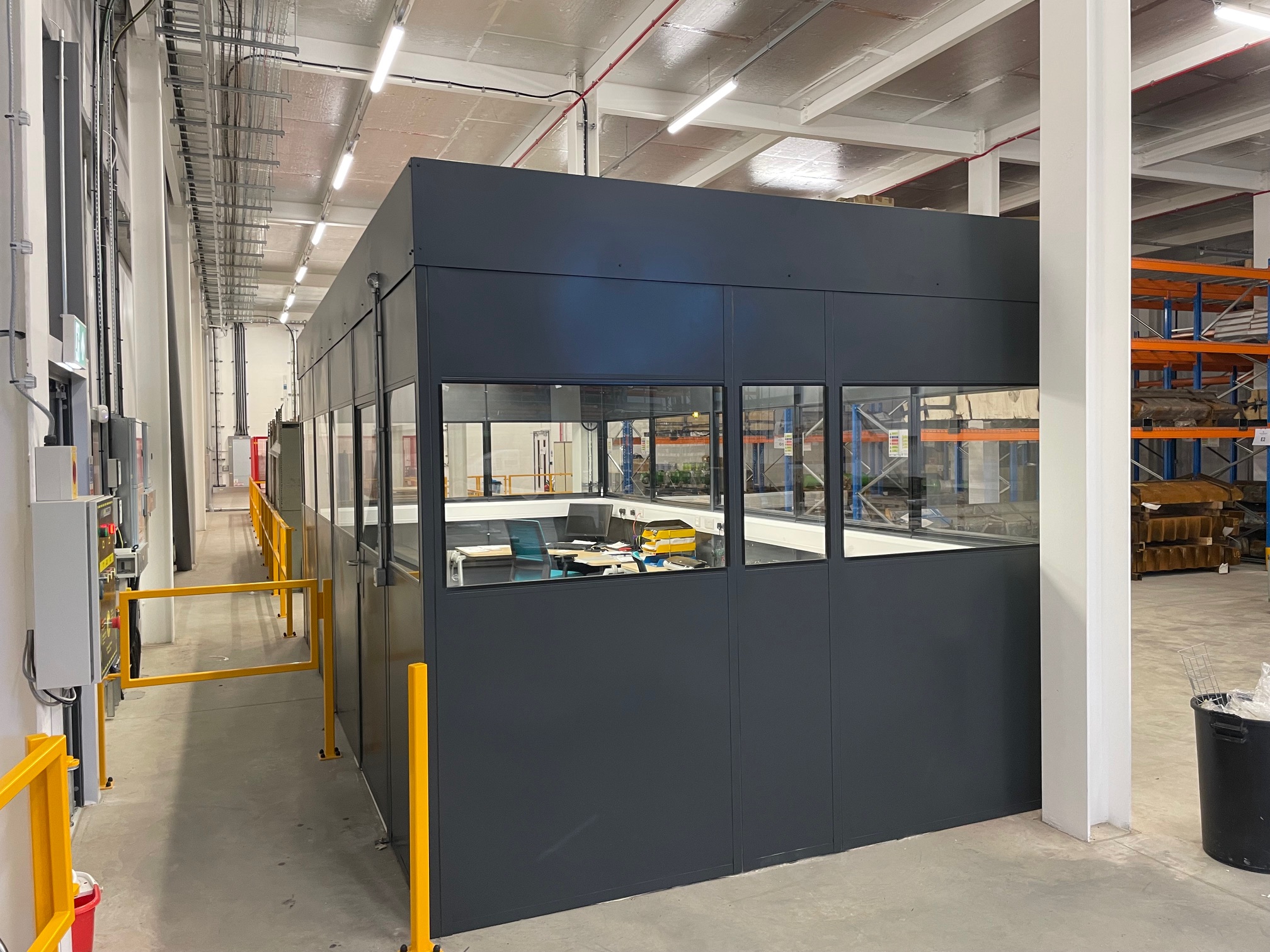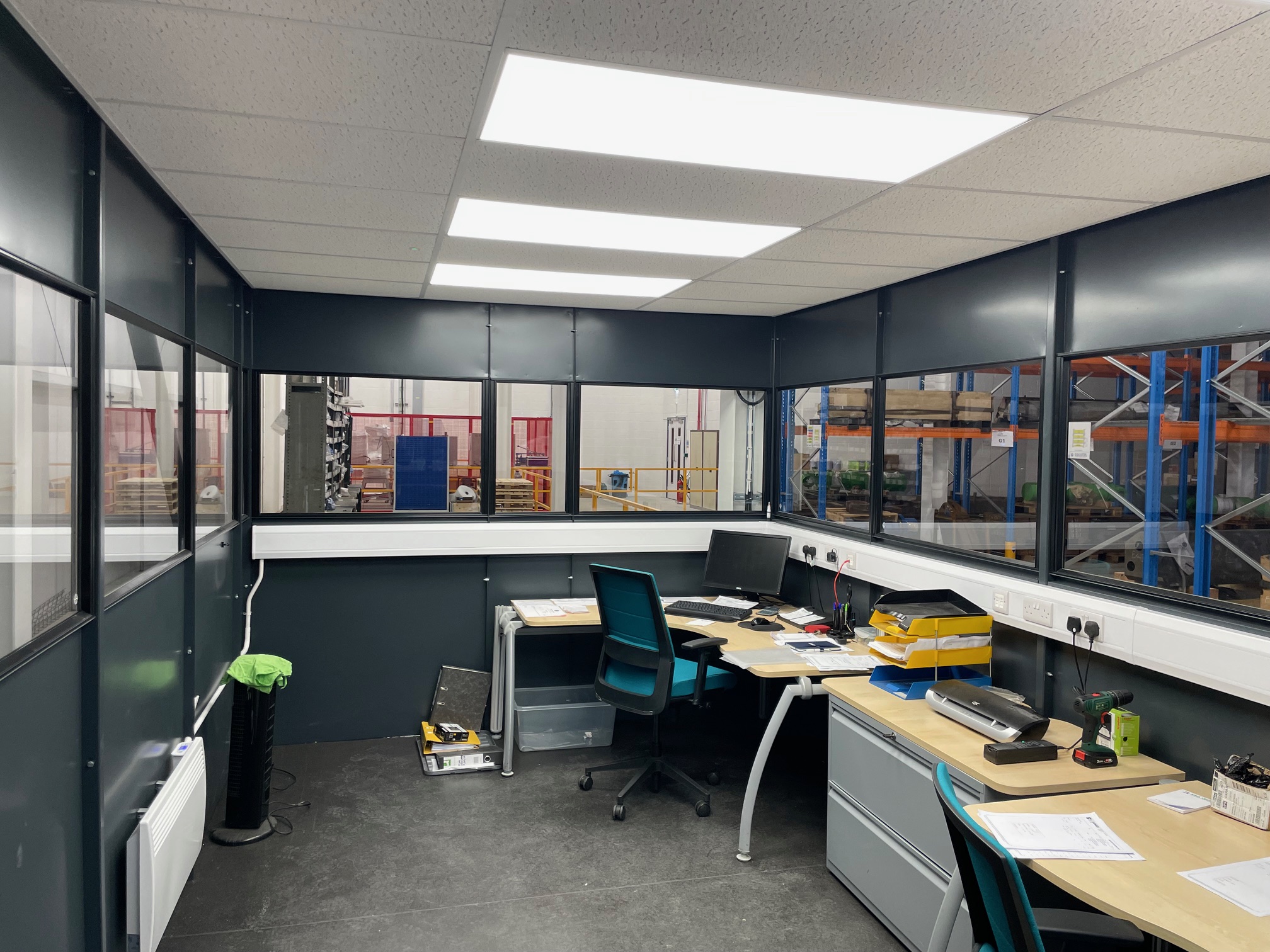 This Single skin steel partitioning system was designed and made into a warehouse office and was installed in Rotherham. The warehouse office was of all solid / glass / solid elevation and supplied in standard Graphite Grey.